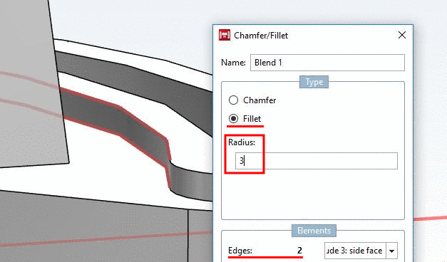 2. Selection of both edges and definition of Chamfer/fillet Radius "a" and "b" (here 3 mm)