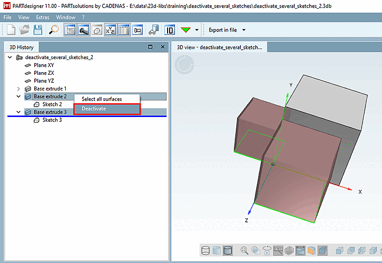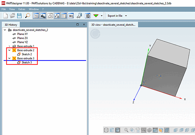 Sometimes it makes sense to temporarily disable one or several sketches (Base extrude / Cut extrude) (e.g. for testing purposes).