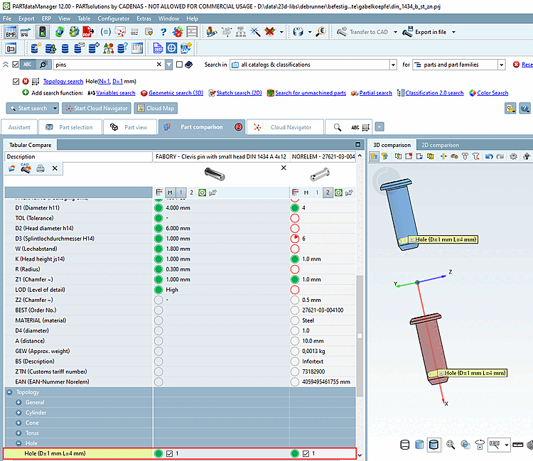 By default, the display of topological information in the component comparison [Part comparison] is switched off. However, when the search results of a topology search [Topology search] are opened, the topological features are already marked under Tabular comparison [Tabular Compare], the corresponding checkboxes are already selected and the corresponding information is also displayed in the 3D comparison.
