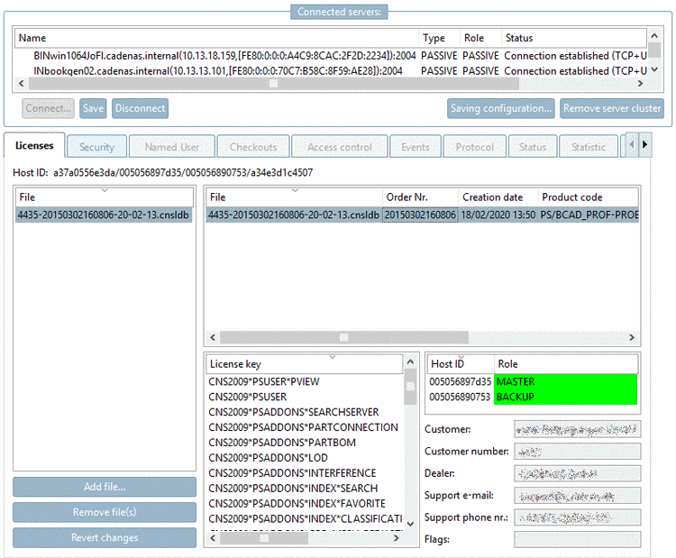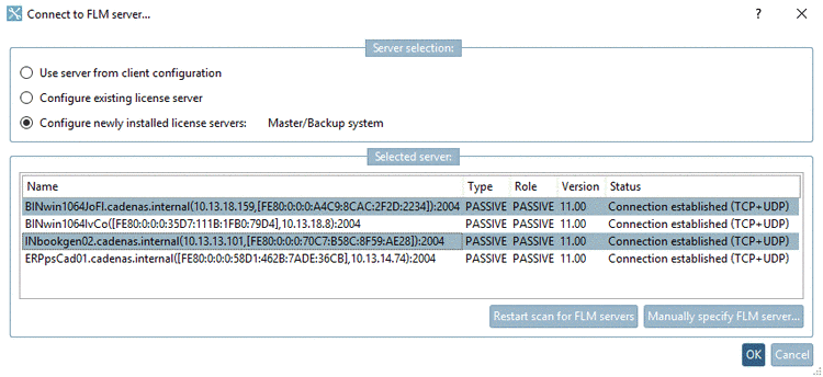 The chosen license servers are displayed in the dialog area Connected servers (Type and Role still on PASSIVE).