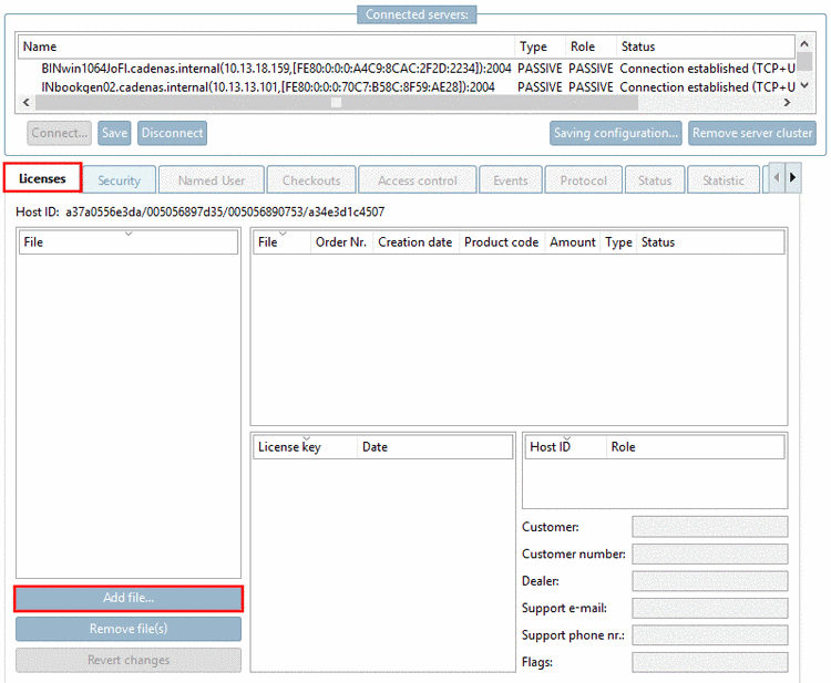 Switch to the tabbed page Licenses and click on Add file.... In the Explorer window determine the desired license file.