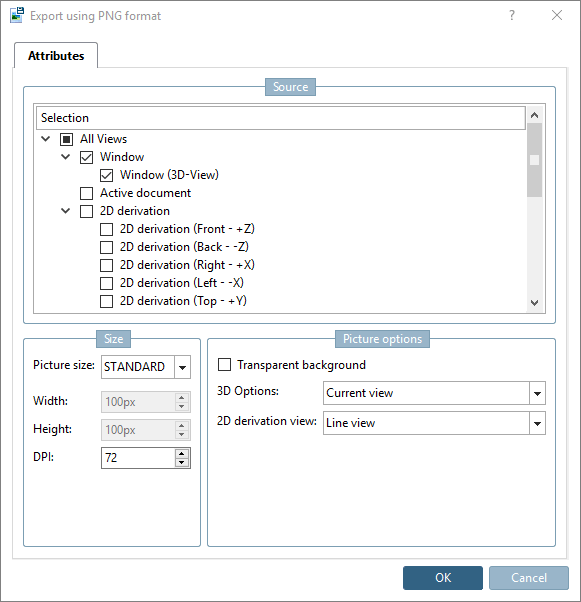 If PNG is selected under Format, the Export in PNG format dialog page opens after confirming the settings with .