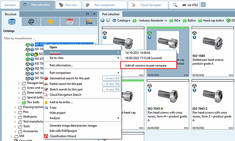 If you have kept the old versions when installing the catalog, you can open the old versions via the submenu of Versions or add them to the component comparison [Part comparison].