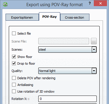If POV-Ray is selected under Format, the Export in POV-Ray format dialog page opens after confirming the settings with .