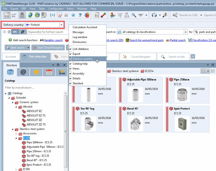 The selection of the desired mode happens in PARTdataManager under Extras menu -> Select mode. The default mode is stated in $CADENAS_DEFAULTUSER/partsolu.cfg -> block [TWEAKMENU] -> key "PARTdataManager_Mode" or "PARTproject_Mode". The respective menu item is displayed, if the key ModePreferences is set on true in the respective block.