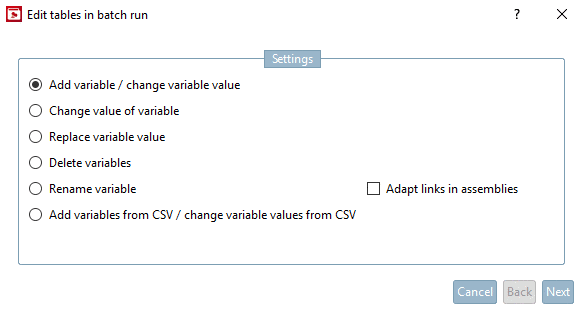 Report generations on server... ExtrasServerJobList Connect assemblies automatically Start VBS/VBB script... Select mode ModePreferences Settings... The creation of the structure happens in the configuration file