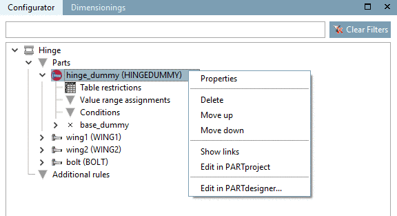 Properties, Delete, Move up, Move down, Show links, Edit in PARTproject, Edit in PARTdesigner