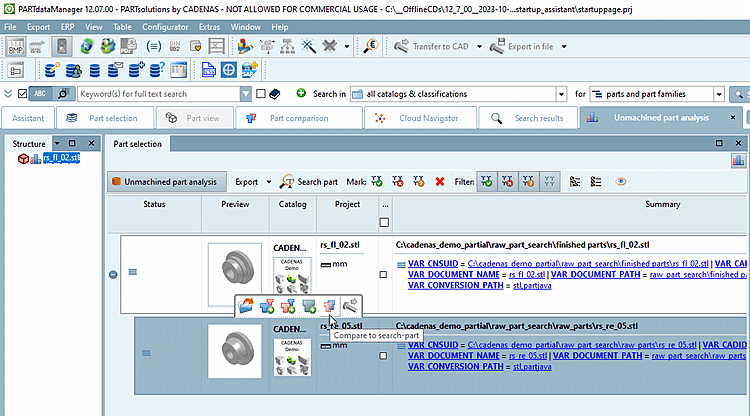 You can use the unmachined / finished part report [Unmachined / Finished part report] to determine suitable unmachined parts for the production of a finished part. For example, an engineer needs a special flange. He therefore searches for blanks from which the flange can be produced in order to avoid the unnecessary production (and creation) of a new blank. This process is time-consuming because the parts have to be superimposed one after the other in CAD.