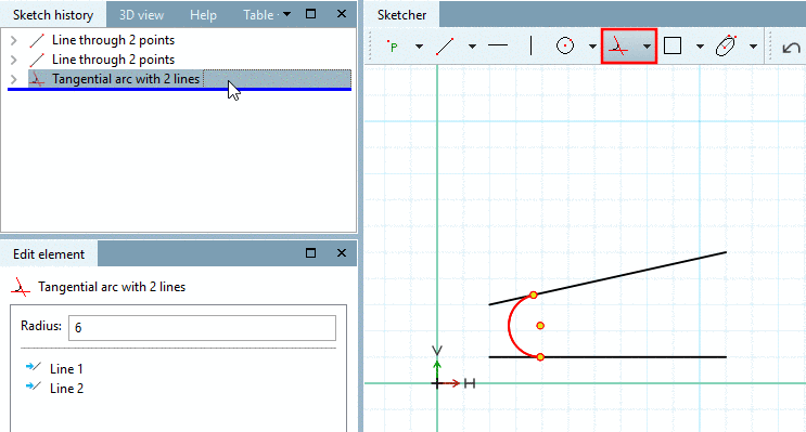 -> The radius is displayed in the docking window Edit element. Changes at the lines have to be directly made in the Sketch history, if needed.