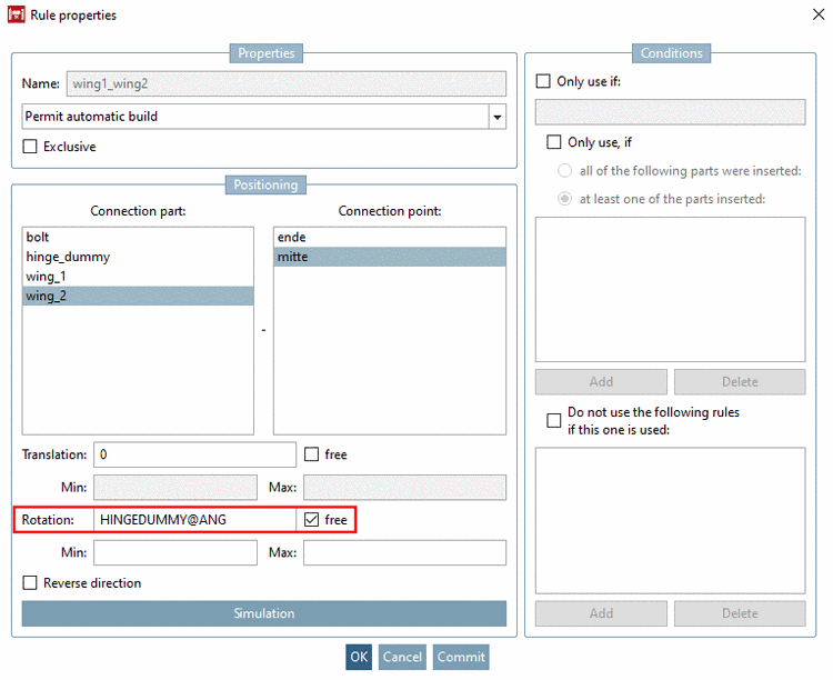 At wing1, call the dialog box Rule properties via context menu of connection point (