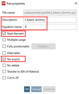 Insert the dummy start part from the directory .../partsolutions/23d-libs/training/subassembly/profile and make the corresponding entries on the part properties [Part properties] dialog page.