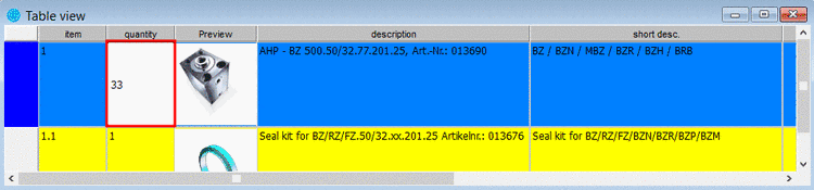 The currently selected Row can always be seen from the blue -marked field at the left. If you double-click on the blue field, providing the relevant individual part has been transferred from PARTsolutions, PARTdataManager is launched and the part is shown in Part view.
