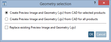 Select the respective option (here exemplified preview image and geometry (.zjv) shall be created only for the selected product) and confirm by clicking on .