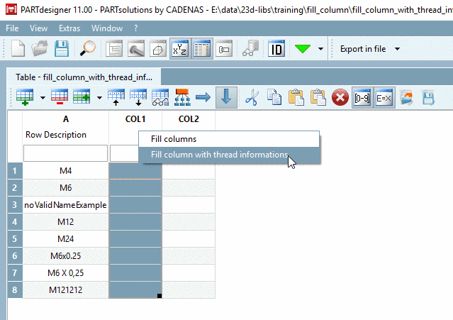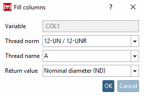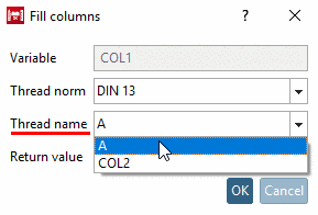 In order to fill columns with values from thread tables, in the column header of the table, use the context menu command Fill column with thread information. Values for nominal diameter (ND), pitch (PITCH), core diameter outer thread (KDA) and core diameter inner thread (KDI) can be entered.