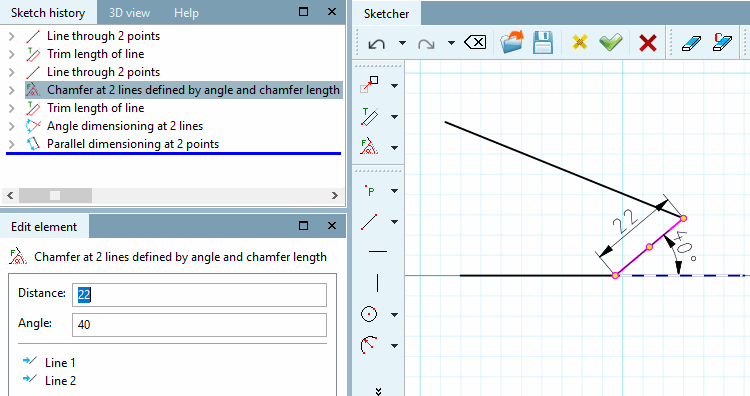 Chamfer between 2 lines, adjustable via angle on first selected line (counterclockwise) and length of chamfer.