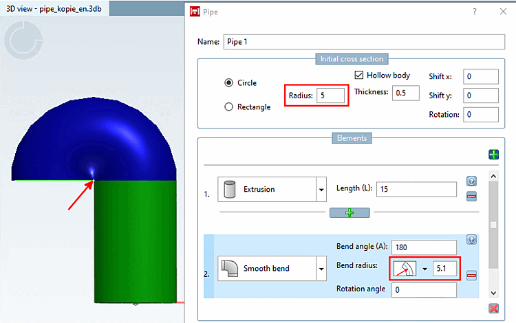 Bending angle [Bend angle]: Enter an angle that describes how far the pipe should be bent in this element (section of an arc). All values between 0° and 360° are valid.