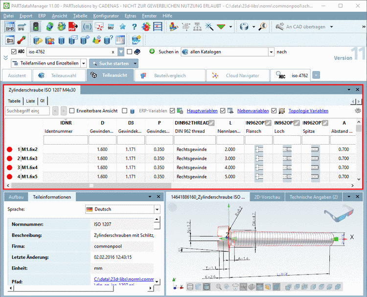 The Standard name must be unique for all lines and value range inputs. That means, if variable parameters are changed by selecting table lines and / or value ranges and the geometry is changed through this, the NB has to change, too. This happens e.g. at stroke positions and angularities, change of dimensions (length, width, hight, ...) and conditioned geometrical buildup of components. During export to CAD or when saving neutral formats, the NB with currently set variable parameters is transformed to a filename.