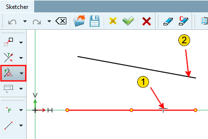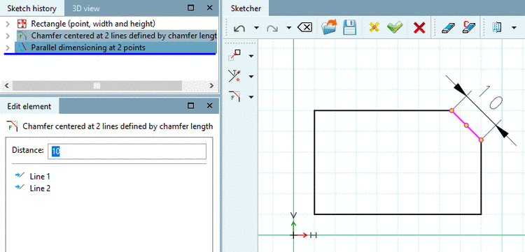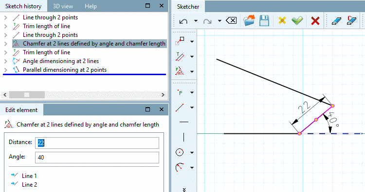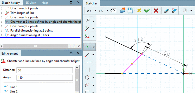 Chamfer between 2 lines, adjustable via Angle on the first selected line or a