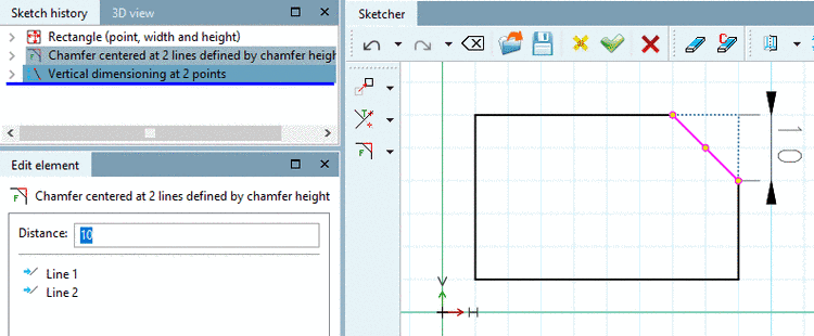 Determine Distance (chamfer length) and Angle in the docking window Edit element.