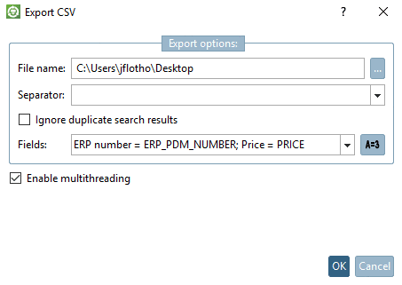 Enable multithreading: Possibly makes sense in order to accelerate the process when using large files, if table variables shall be taken into the CSV. Especially in SSDs and network drives the activation should have a positive effect.