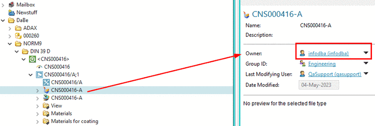 Example: Change the Owner of all CAD Datasets from "qasupport" to "infodba" and the Group from "dba" to "Engineering".