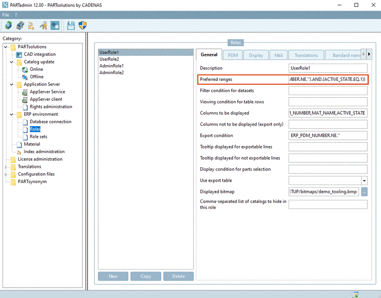 $CADENAS_SETUP/plinkgroups.cfg[Role_nname] PREFRANGE=((ERP_PDM_NUMBER.NE.'').AND.(ACTIVE_STATE.EQ.1))Meaning: The ERP number is not equal empty, in other words available AND the column ACTIVE_STATE has the value 1 (=released).