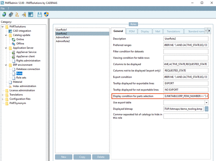 $CADENAS_SETUP/plinkgroups.cfg[Role_nname] CONDITIONTREE=(LINKTABLE.ERP_PDM_NUMBER<>'') AND (ACTIVE_STATE=1)Meaning: ERP number is not equal empty, in other words available AND the column ACTIVE_STATE has the value 1 (=released).