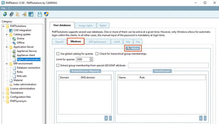 Once under PARTadmin -> category Rights administration -> tabbed page User databases, on the tabbed page Windows, the option Active is activated, a user-related login can happen.