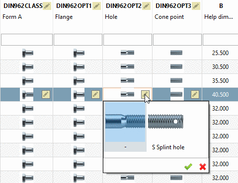 A cylinder head screw ISO 4762, for example, there are types with and without splint hole. If the function is activated DIN962 columns are not displayed.