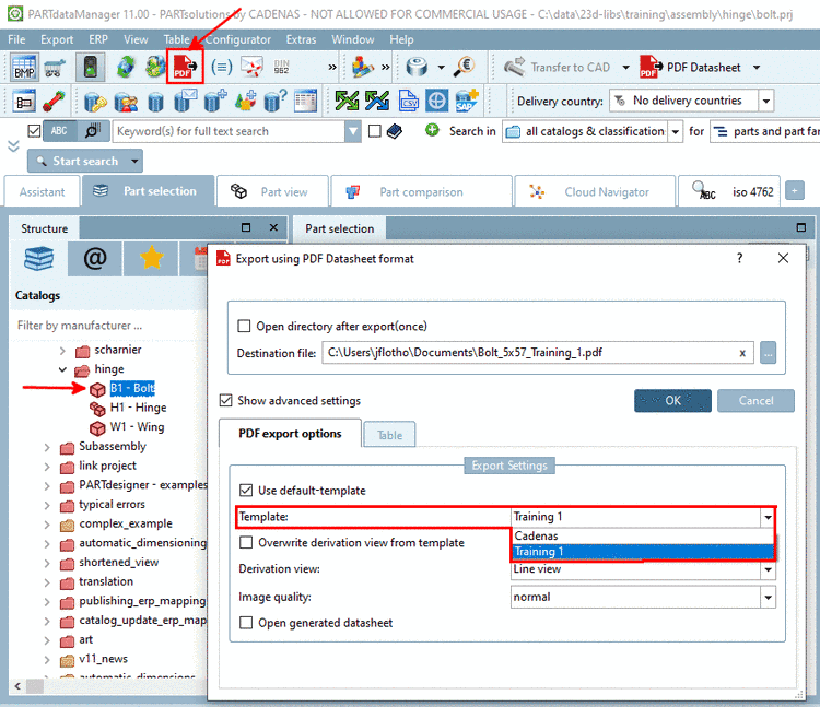 In PARTdataManager, call the dialog box Export using PDF Datasheet format via icon PDF Datasheet