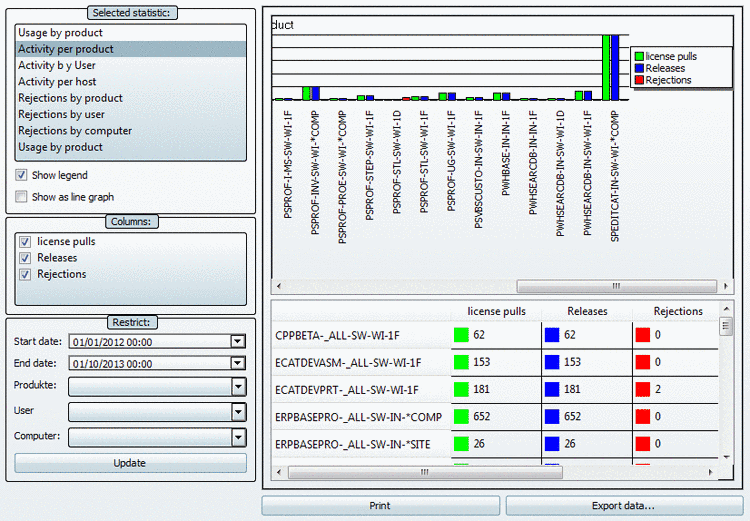 The statistic Usage by product lists the maximally available and used Floating licenses for all products within the defined period of time. If the number of In use (floating) licenses is very close to the number of available licenses, then you should consider the increase of capacity, even if there were no rejections yet. Also see the statistic types Rejections by product, Rejections by user and Rejections by computer.