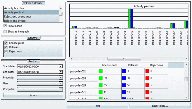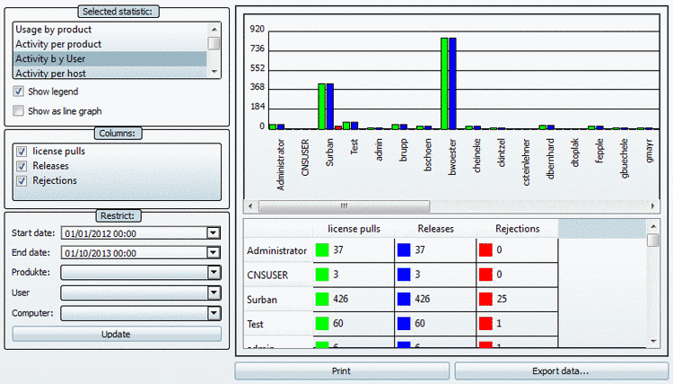 Used (sum): Is according to In use (floating). This statistic type is especially suitable for shorter periods of time, let's say 7:00 to 12:00 of a certain day. You can recognize the level of fluctuation, in relation to a certain product. High fluctuation confirms, that your decision for Floating licenses is correct.