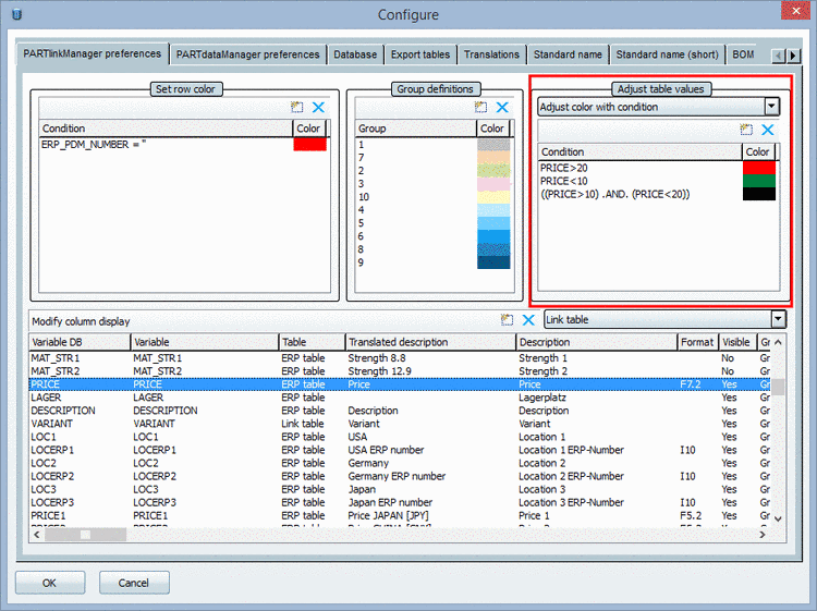 Setting in user interface under PARTlinkManager -> Extras menu -> Configure dialog box -> PARTlinkManager preferences tab -> Adjust table values -> Adjust color with condition