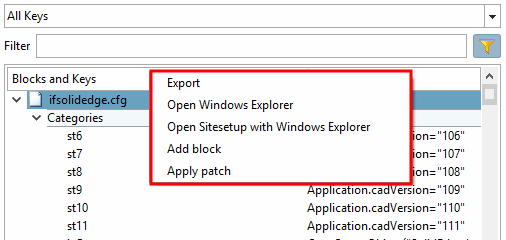Via context menu command, you can add blocks and keys and duplicate keys. These commands are found in all main directories ($CADEANAS_USER, $CADENAS_SETUP,$CADENAS_DATA/datasetup). Under $CADENAS_DEFAULTUSER you can find further extra commands [see Section 1.7.1.4.4, “Additional functions in $CADEANS_DEFAULTUSER ”]).