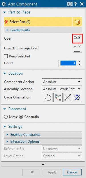 Open the list field under Assembly Location and select the option Absolute - Work Part.