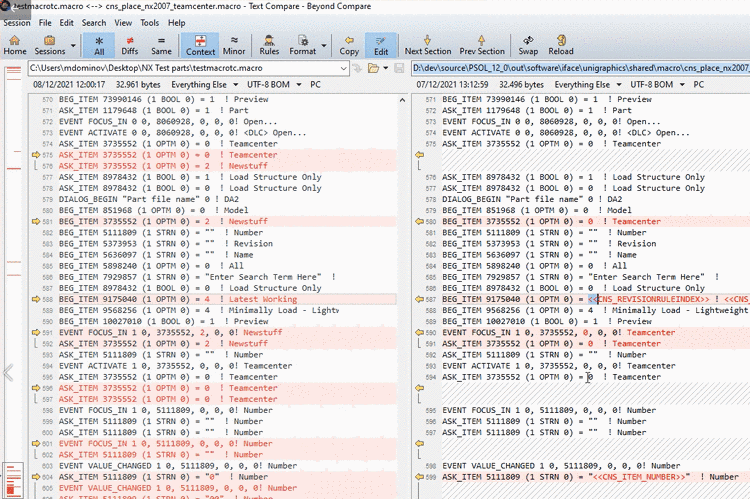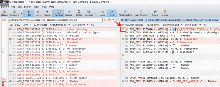 Transfer these lines into the recorded macro with the help of the used comparison tool; in above figure by clicking on the yellow arrow.