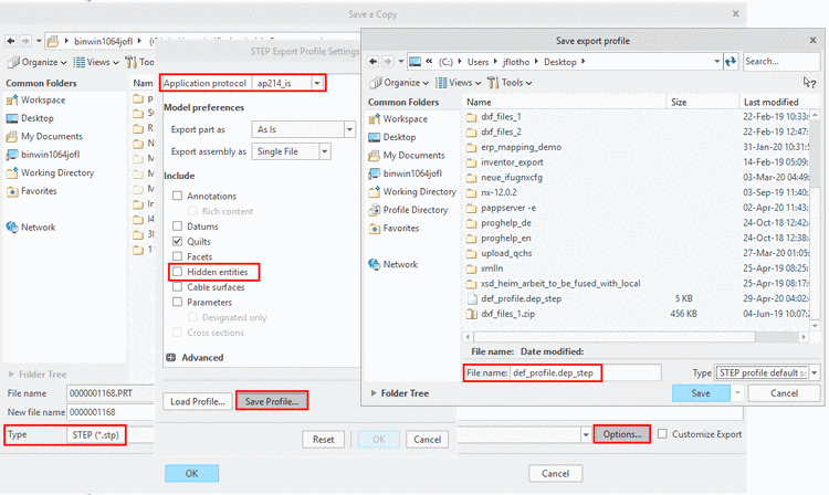 STEP Export Profile Settingsvia "File > Save As (Type=STEP) > .Under Application protocol, choose the option "ap214_is" and deactivate the option Hidden entities.