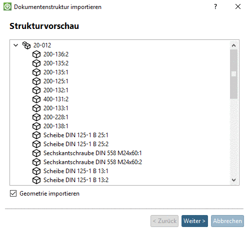 In the Import document structure dialog box the section Structure preview opens and the document structure of the assembly loaded in the CAD system is displayed.