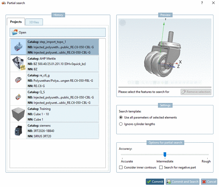On the tabbed page Projects, the lastly loaded parts are listed. When selecting the desired search part, it is displayed under Preview on the right.