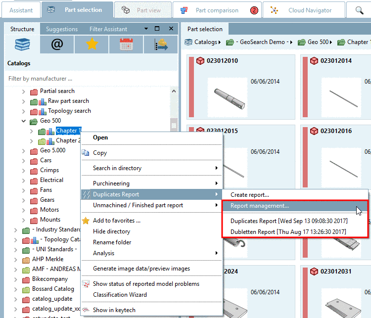 Furthermore existing reports are also listed in the context menu.