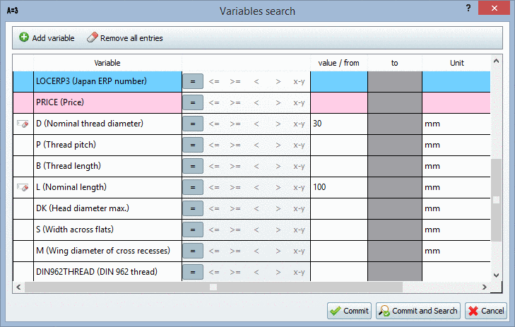 -> The dialog box Variables search opens. The input field of the variable D is already selected.