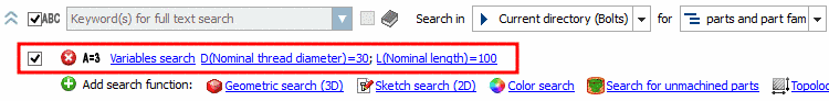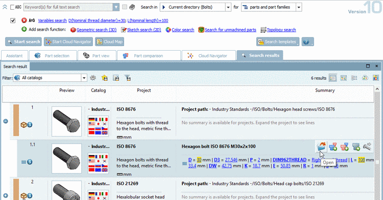 On the tabbed page Part selection -> subpage Structure -> Catalogs, limit the search on Standards -> ISO -> Bolts