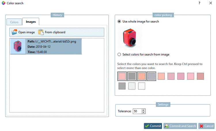 The Color Search contains two options: You can determine colors via color palette or load a picture, where the relevant colors are automatically scanned from. In the case of complicated dye distribution using an image file is advantageous.