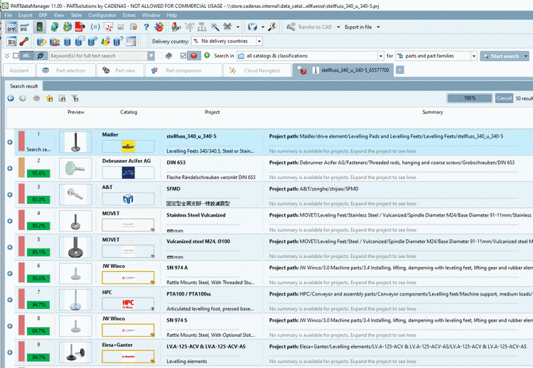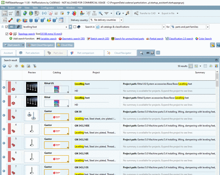 As parts equivalently usable do not always have the same name, a Full-text search using the search term "levelling foot" will not find parts named with "mounting foot", for example, which however could also be used. Furthermore untranslated terms in different languages cannot be found.