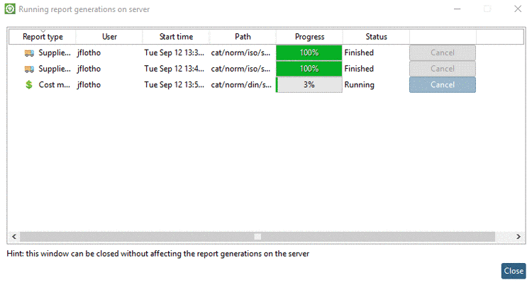 -> The analysis is started. In the dialog box Running report generations on server, you will get informed about the progress.