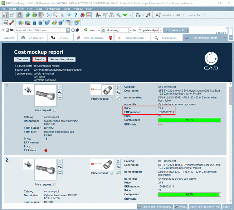 Under Results you get a listing of all matching comparison parts within the respective catalog, according to the settings with ERP number and price in addition.