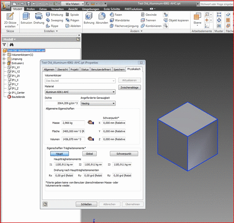 • If a volume has been transferred from PARTsolutions, then thereof mass and density are calculated by Inventor.