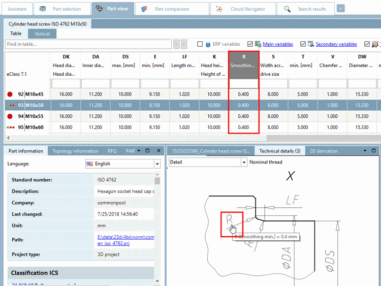 Technical details are also displayed in Part selection and under Search results in the tooltip. Compare Fig. „Example: 3D Tooltip + Technical details in "Symbols" mode“ or Fig. „Mode "Table"“. | |
