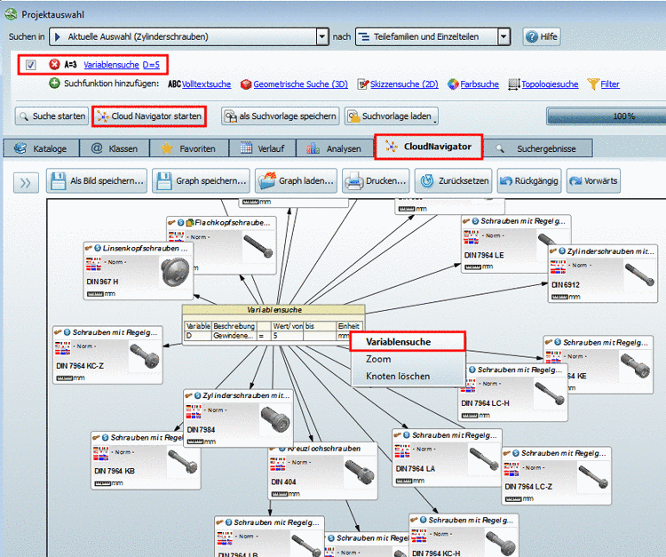 In this example it is searched under "DIN -> Bolts -> Head cap bolts". (The dialog box shows the according geometric variables.)
