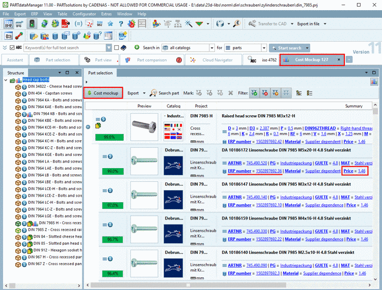 In this example, for the directory Zylinderschrauben, prices of comparable bolts shall be compared in a supplier catalog.
